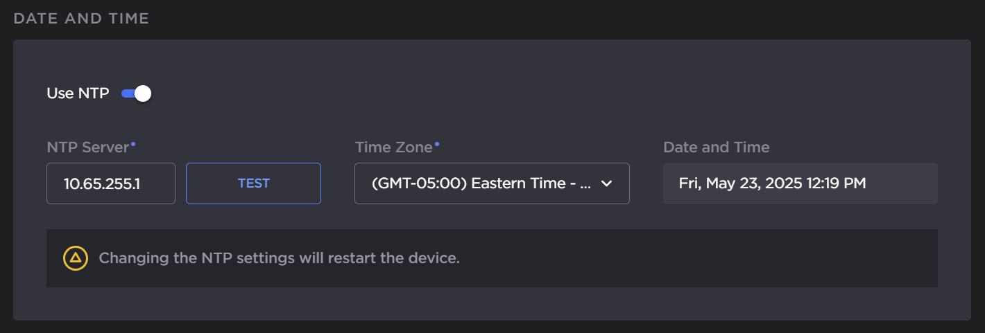 After entering the address of the NTP server you wish to use, click the Test button to ensure you can connect to it.