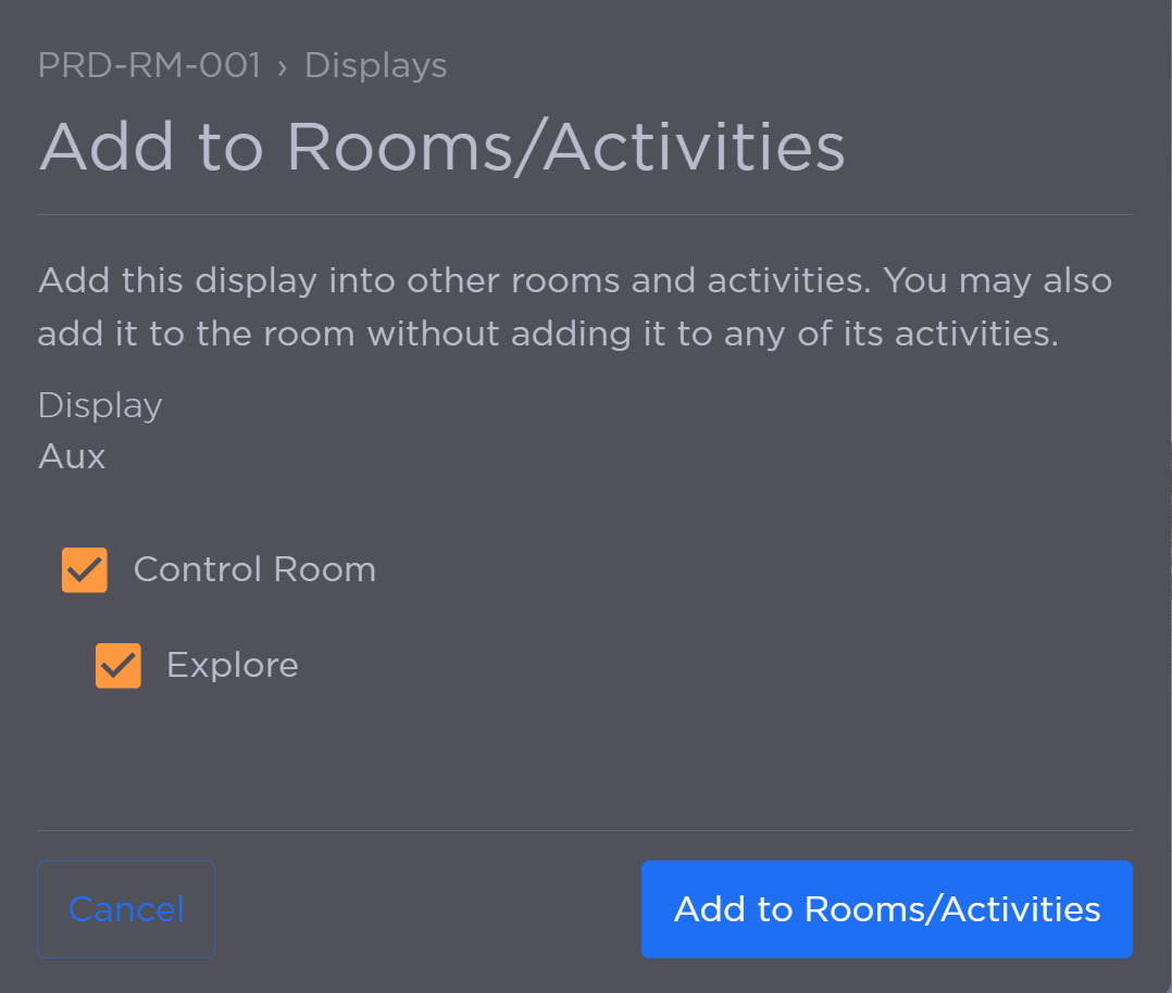 The Add to Room/Activities menu option allows you to assign a display to a specific room. A display can only be assigned to one room.