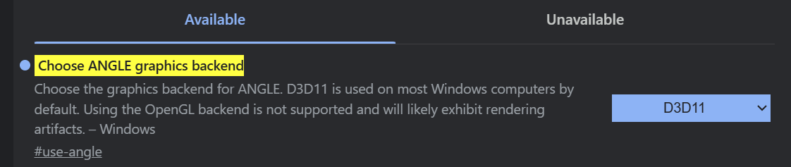 Next to Choose ANGLE graphics backend, click the drop-down and select D3D11.
