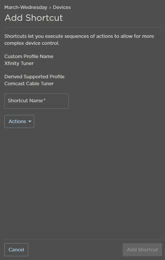For Delay Actions, enter the Time (in seconds) to delay the next action. This can be useful, for example, when creating a shortcut on a cable tuner to tune to a specific channel that requires multiple button presses.