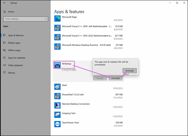Under Apps & features, locate MrtSetup.