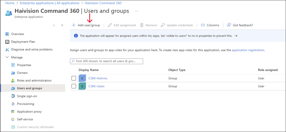 Click Add user/group and add users and groups from Entra ID as needed. You must add a user or group that will function as the Command 360 administrator (e.g., C360-Admins).