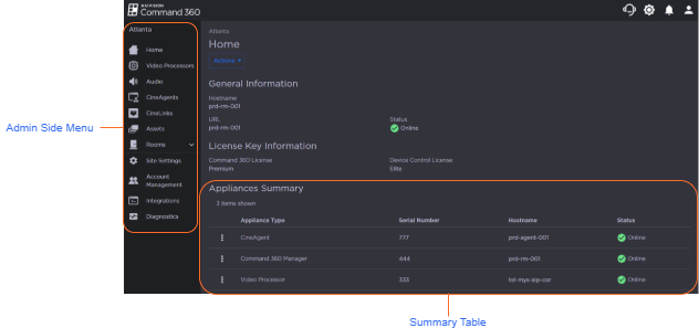 The Admin interface contains a navigation pane on the left side of the screen that allows you to access system components. The top of the navigation pane (directly underneath the Haivision Command 360 site landing page shortcut) displays the site name.