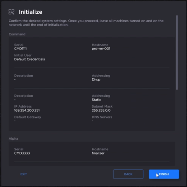 After confirming settings, click Finish. The system initializes.