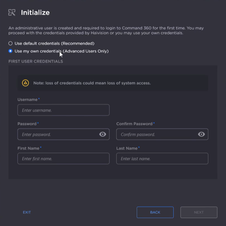 After configuring network settings, you must create an initial administrative user who will log in to Command 360 for the first time.