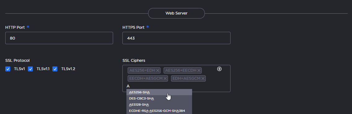 SSL Ciphers | To specify which SSL Ciphers are accepted, select from the drop-down list or type in another cipher name: ![]() |