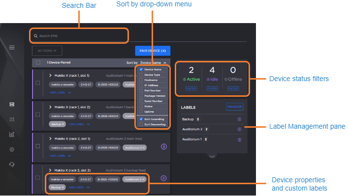 Devices can be searched for, filtered, and sorted according to their properties, status, or applied labels.