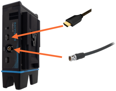 Connect to the unit one of the following external power sources: the supplied AC/DC adapter (USB-PD 3.0 compliant and providing more than 65W), or an external V-Mount or Gold-Mount battery (not supplied) using the included DTAP-to-USB-C cable.