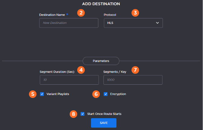 On the Route screen click the +Destination button. The following dialog appears, with required fields identified with a blue asterisk. The numbered callouts in the figure indicate the step number in this procedure.