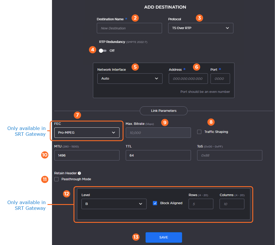 PRO-MPEG FEC is available only on Haivision SRT Gateway.