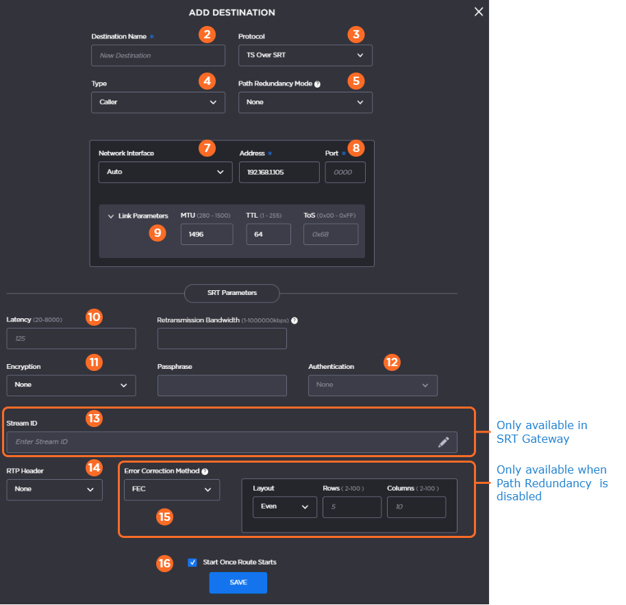 Optionally enabled/disable the destination to automatically start when the route is started, and click the Save button.