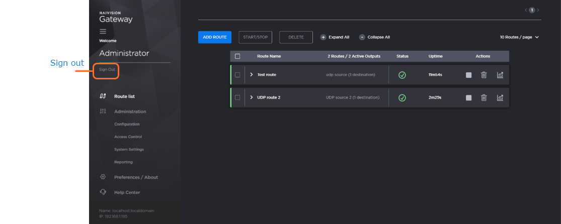 When signed into the Web interface, click the Sign Out action link at the left side of any screen to sign out.