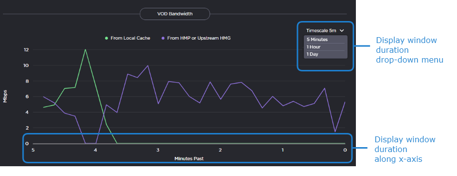 Use the drop-down menu at the top of the chart to specify the display window for the graph starting from now (that is, "0"). When the actual timeframe exceeds the specified display window, only the most recent data of the specified length of time is displayed. That is, if 5 Minutes is selected, only the last five minutes of data is displayed. Any data older than five minutes is dropped from the graph.