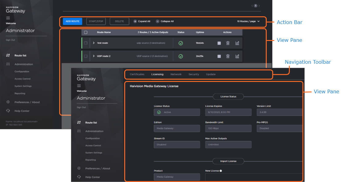The view pane displays the appropriate items, fields, or status information for the currently selected screen.