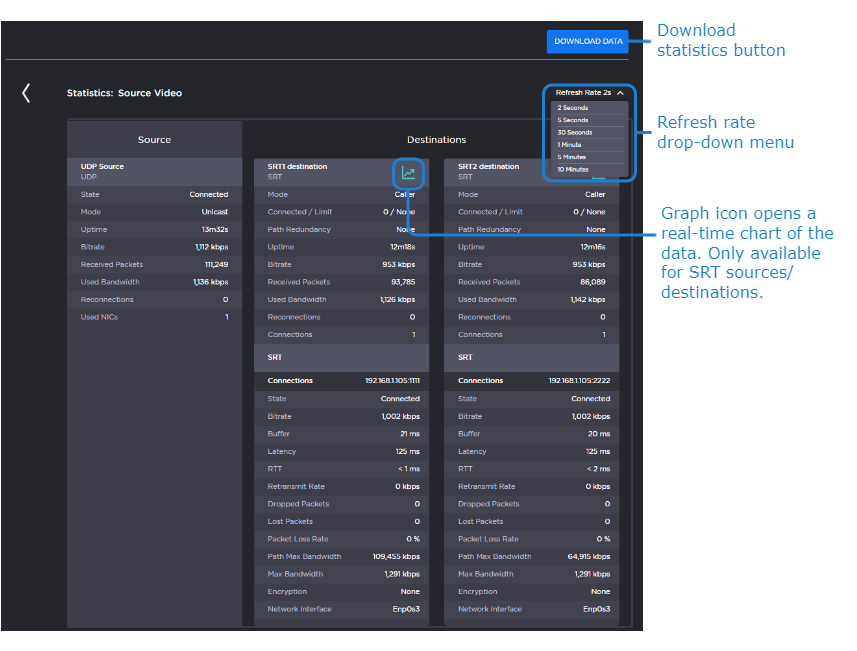For SRT Listener streams, you can view the statistics for each connected client by selecting the Client in the dropdown menu, as shown in the following figure.