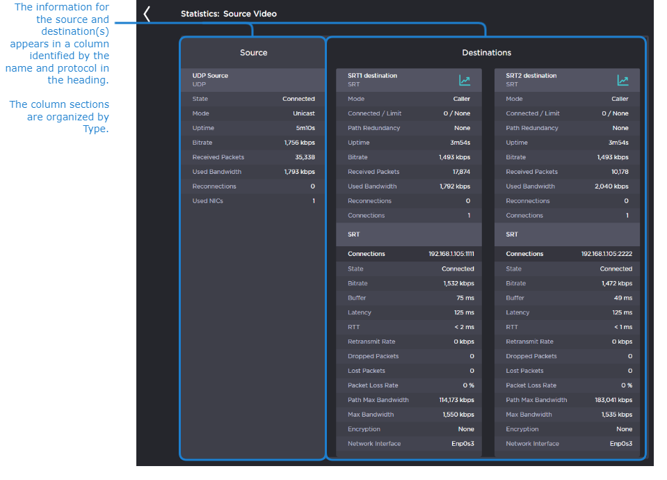 When the Statistics page appears, you can view the pertinent data for the routes' source and destinations. See Stream Statistics Field Descriptions for detailed descriptions of each statistic.