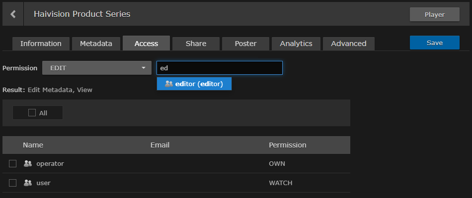 Depending on your account Role and Access Permissions, you can change the permissions of videos, sessions, sources, and feeds for other users or groups. This allows other users or groups to view the video (live or recorded) and metadata, to edit the metadata, and in the case of sessions, to start their own recordings. You can specify permissions for each user or group that you invite.