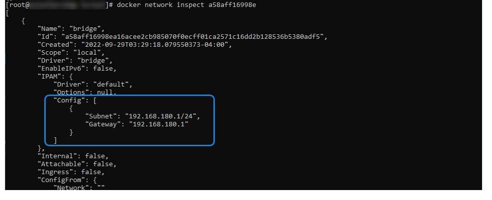 docker network lsUse the following command to inspect these network settings using the ID values found in step #2:
