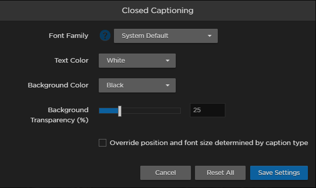 icon, then Caption Settings.Click the Reset All button to revert to the default settings defined by your administrator.