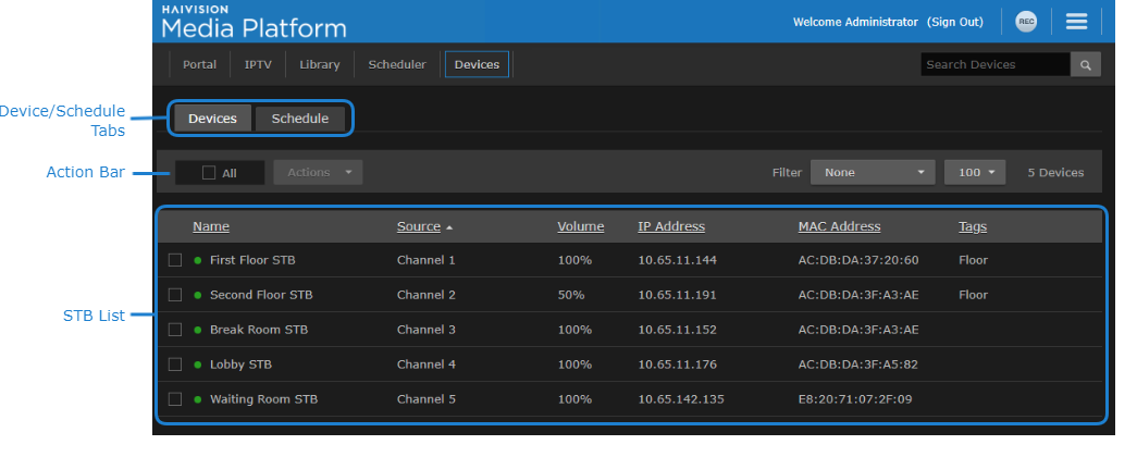 To get started with managing your connected Haivision Play Set-Top Boxes, see Managing and Scheduling Devices.