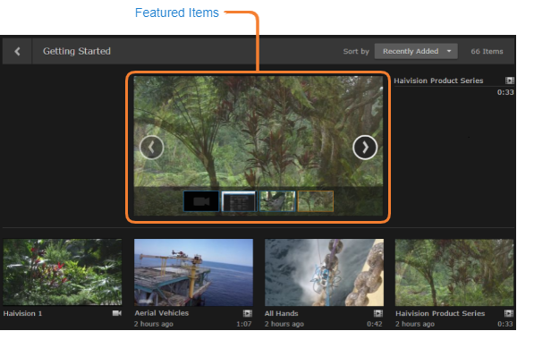 Video feeds are used to display frequently updated content. For each feed on the Portal, items are displayed in a scrolling strip. Clicking the arrow to the right or left of the strip scrolls through the remaining thumbnails.