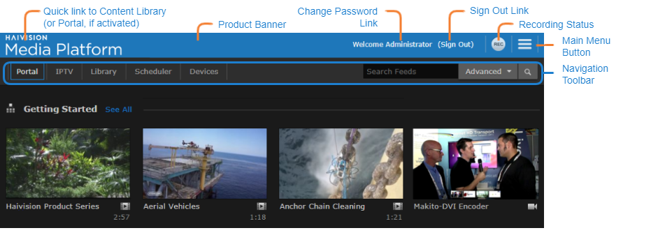 To access the home screen from anywhere within the web interface, simply click on the Haivision Media Platform logo in the product banner.