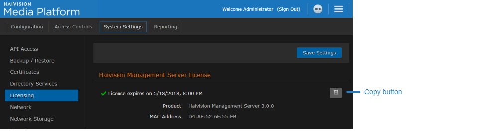 To run Haivision Media Platform under a VMware platform, you need to obtain a valid license key for the VM from Haivision Technical Support and enter this on the Licensing page.