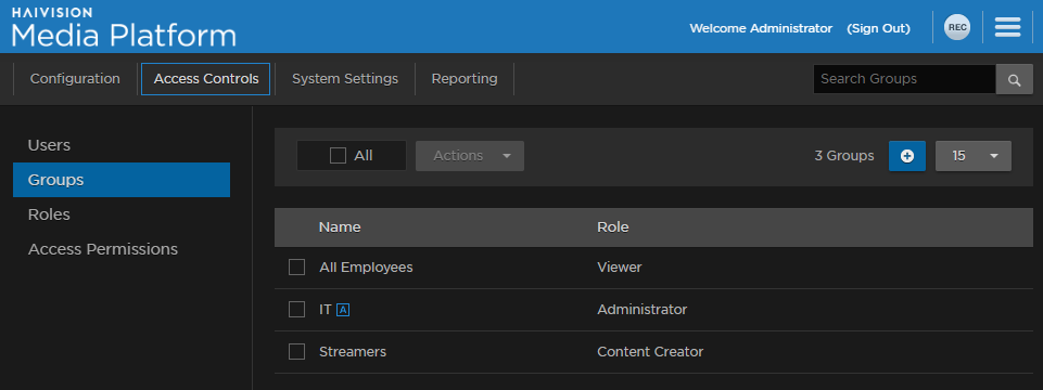 If Haivision Media Platform is connected to an LDAP or Active Directory server, the Groups list is populated with information from the directory server. From the Groups list, you can assign roles to groups. This provides a means to efficiently manage multiple users. You cannot add or modify groups directly from HMP.