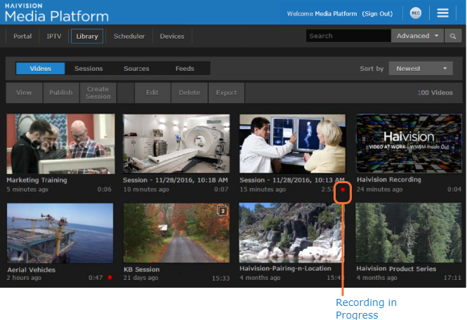 Locate the video to play, hover the mouse over the item, and click the icon. For viewing and search options to locate videos, see Exploring the Web Interface.