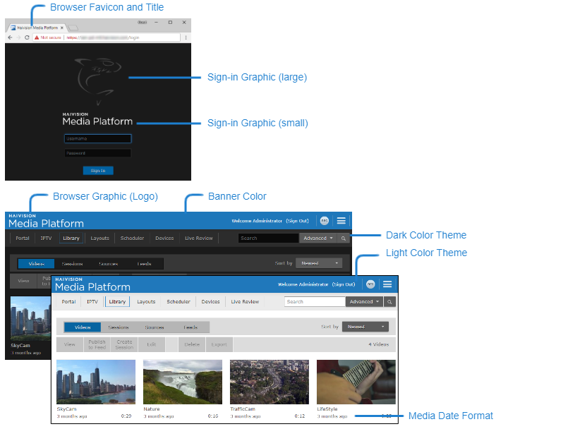 From the User Interface page, you can customize the Haivision Media Platform user interface to suit your organization's needs. For example, you can add your own branding images and color (which are applied to all users the next time the user's browser window is refreshed). You can also disable the display of one or both Sign-In page graphics. Also available on this page, is the ability to customize the default display of closed captioning in the modern web player.