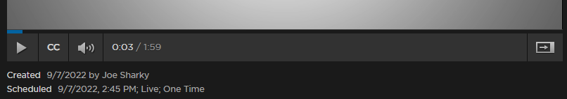 By default, when a user streams content in a session or video from the Portal view, the browser displays "Created" and "Scheduled" information below the player window like the following:
