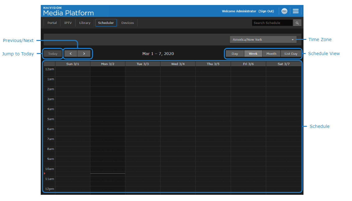 • To change how the schedule appears, click the Day, Week, Month, or List Day buttons.
