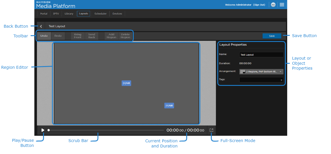 The Layout Editor allows you to fully customize the layout of the content sent to your connected Haivision Play Set-Top Boxes. You can define multiple regions, with each region able to contain any videos, sessions, and sources that are created on your HMP system. You may also add static images or custom HTML hosted outside of your HMP system.