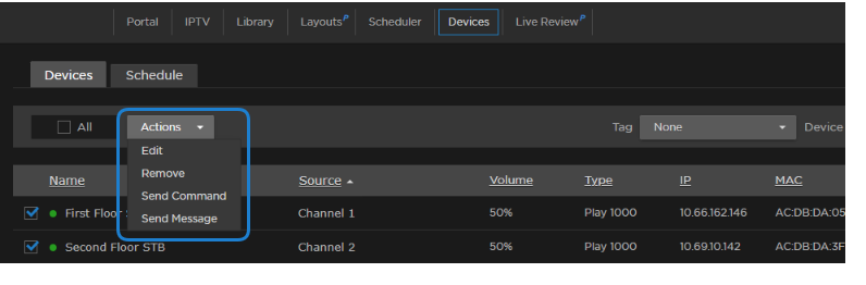 Multiple devices can be selected by clicking the checkbox next to each device in the list. Holding the Shift key on your keyboard can also be used to bulk select items in the list. For example, click the first STB's checkbox in the list, press and hold the Shift key, and click the tenth STB's checkbox. All 10 STBs are selected.