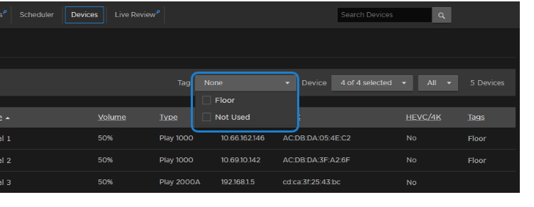 You can also filter the displayed list by tags (if defined on your system). Simply click in the Tag dropdown and select the tag to filter by. This is useful to narrow down and manage a long list of devices. To add or delete tags, see Editing Device Settings.