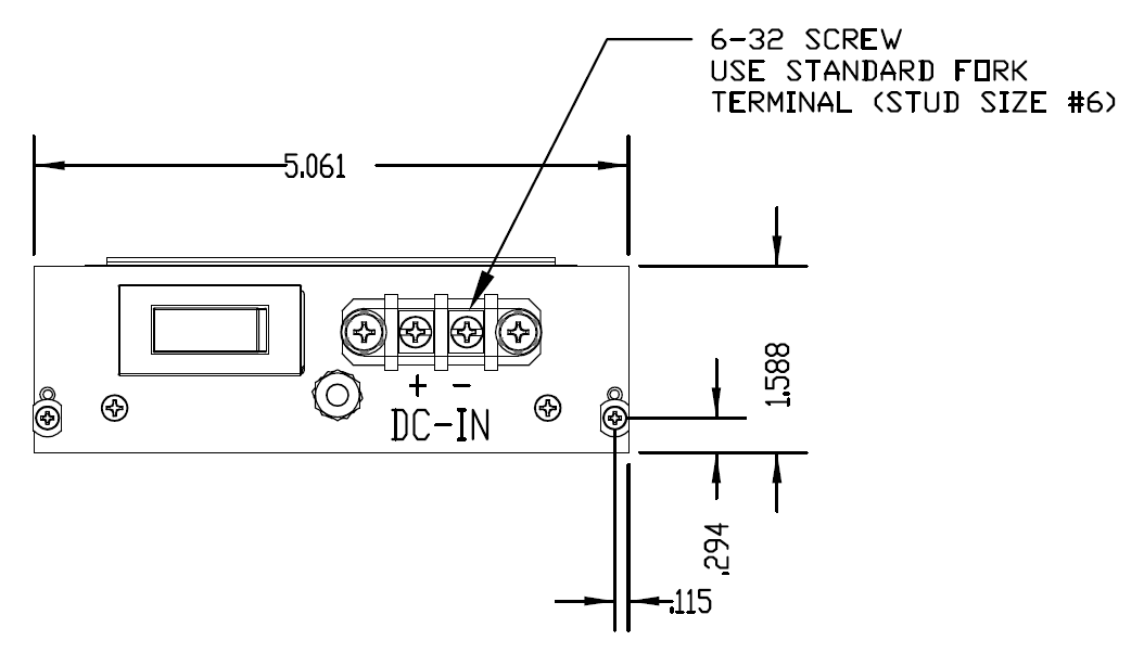 Connect the screw marked + to a +28 VDC power source and the screw marked - to the neutral wire. The maximum width of the terminal lug is 0.32 inches (8.13 mm). The minimum wire gauge is 16 AWG.