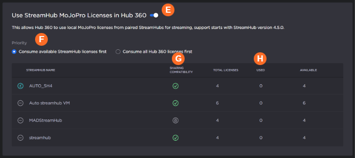 | The toggle allows your Hub 360 subscription to use MoJoPro licenses that are available on your paired StreamHubs. |