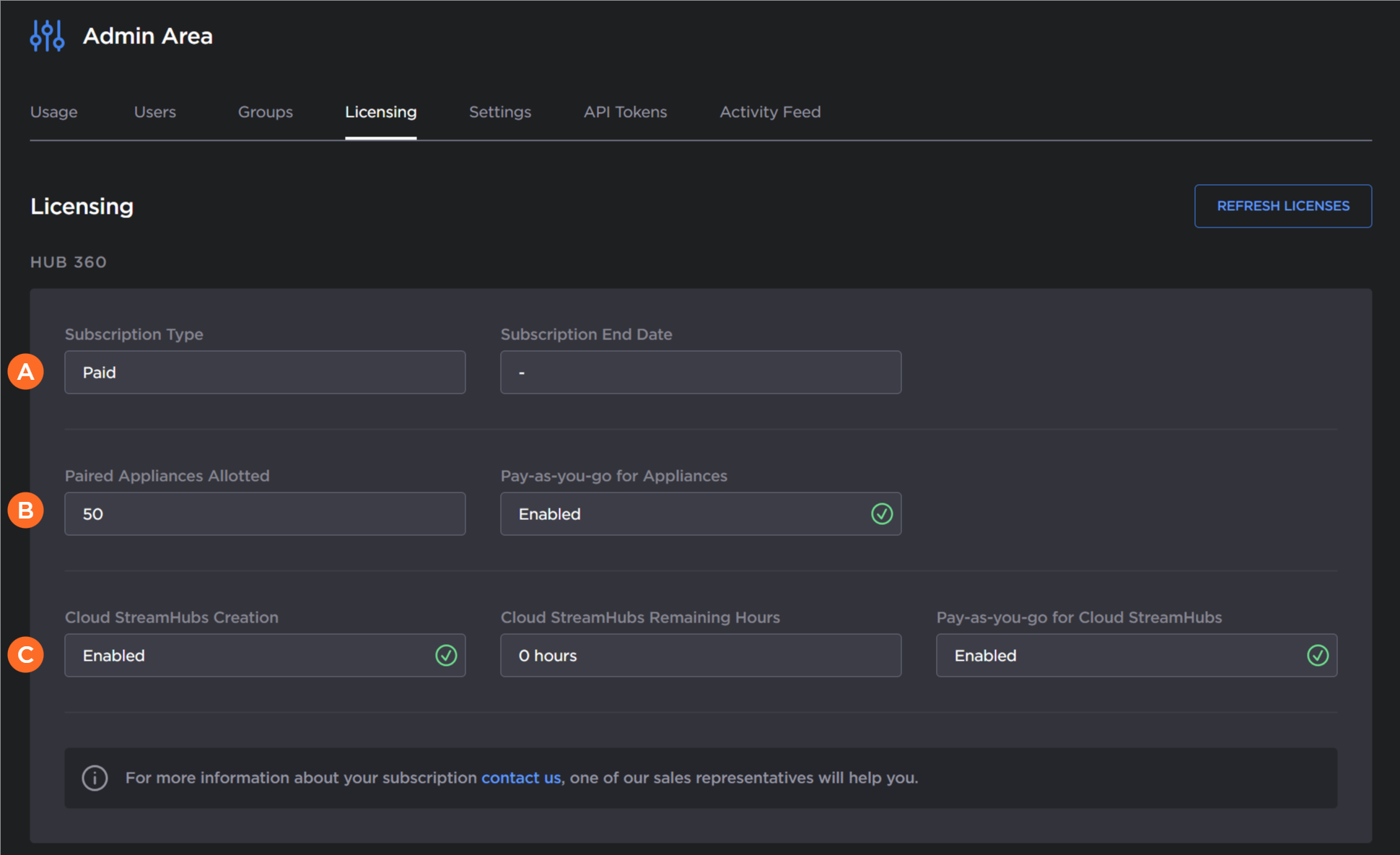 The top of the Licensing page shows details about your Hub 360 subscription.