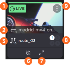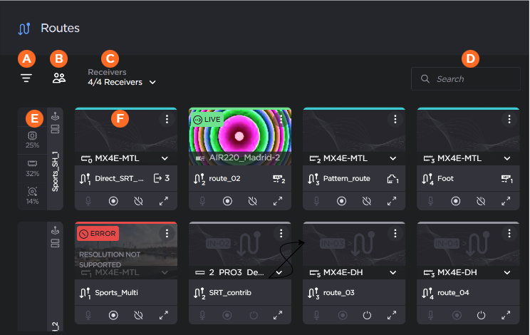 | Route Tiles are assigned to the inputs of the receivers. The Route tiles consist of a thumbnail preview (if Live) and a variety of controls and status information. See the following section for more details. |