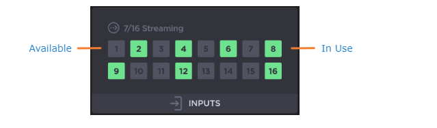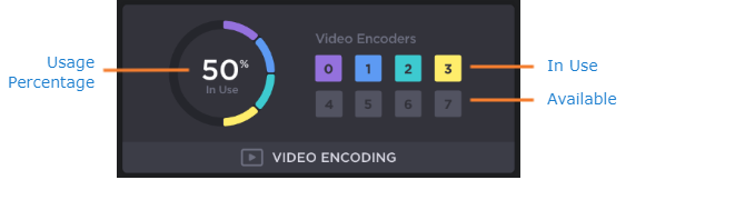 Graphical representation of the CPU, memory, disk space, inputs, outputs, and encoders usage. If an input, encoder, or output is in use, the 'slot' is highlighted. Unused/available inputs, encoders, or outputs are shown in gray.