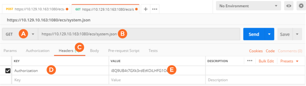 https://<KB URL>:1080/ecs/channels.jsonClick the Headers tab: In the Key column, type Authorization and in the Value column, paste the Session ID value you copied in the previous section.