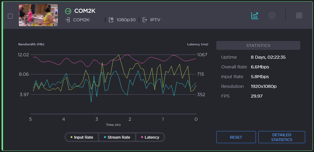 To view streaming statistics, click the Statistics icon. The stream panel expands to show the current statistics. For details, see Viewing Kraken Statistics.