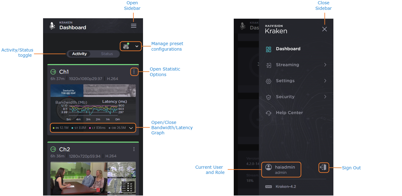 Once you have successfully signed in, the Kraken Web interface opens to the Dashboard. From here, you can use the Navigational Menus to access the Streaming, Settings, and Security sections. For further details on stream and system monitoring from the Dashboard, see Navigating the Dashboard.