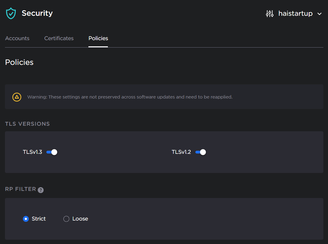 The TLS Version and RP Filter settings are not preserved across software updates and need to be re-applied when running a new version.