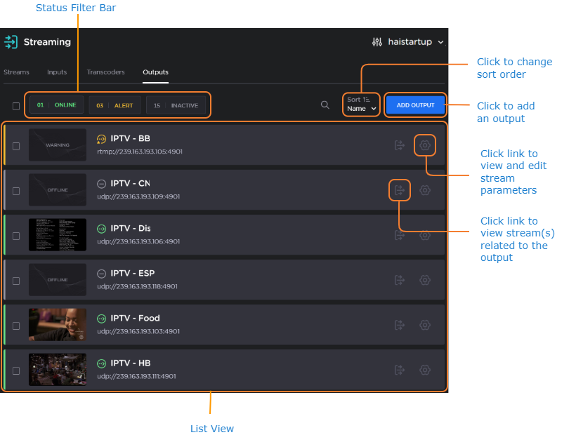 To filter the outputs list view by status, click Streaming, Alert, or Inactive in the status filter bar.
