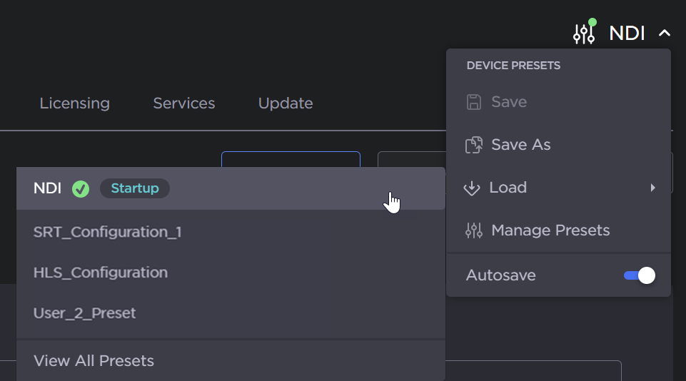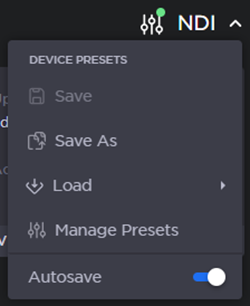 If the presetAutosavefunction has been disabled, an amber warning indication will appear next to the Device Presets dropdown (in the header) on systems with unsaved configurations.