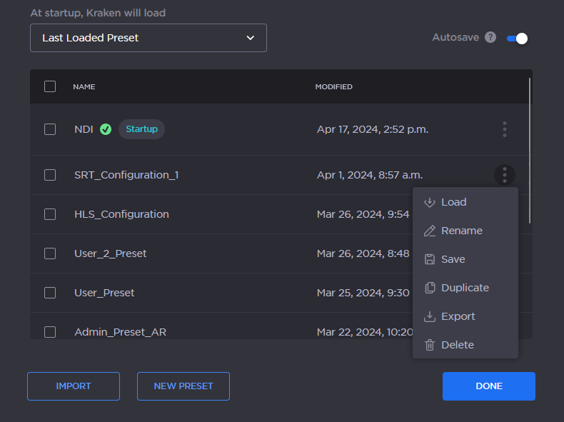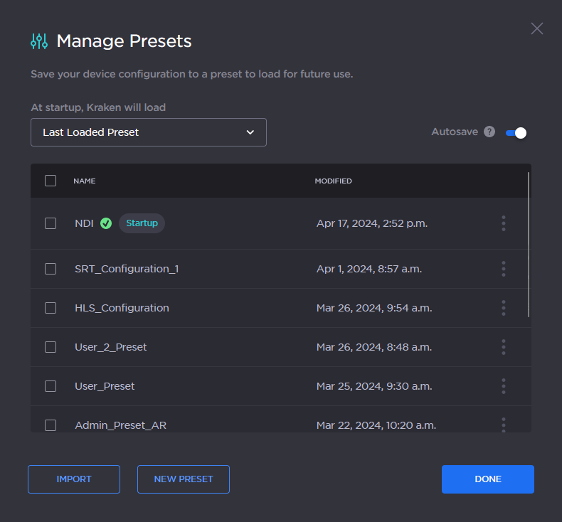 Each Kraken is configured by users' selecting and setting values of applicable system settings, such as transcoder and stream settings and the stream destination. Presets provide a way for you to save groups of settings and recall these configurations settings to apply to other streams.
