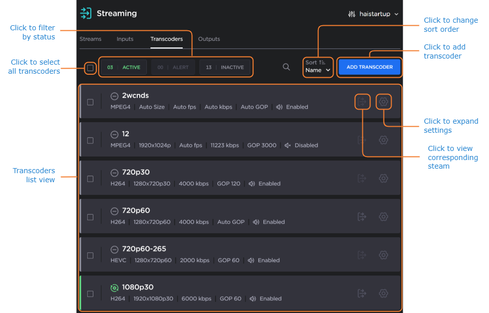 To filter the transcoder list view by status, click Active, Alert, or Inactive in the status filter bar.