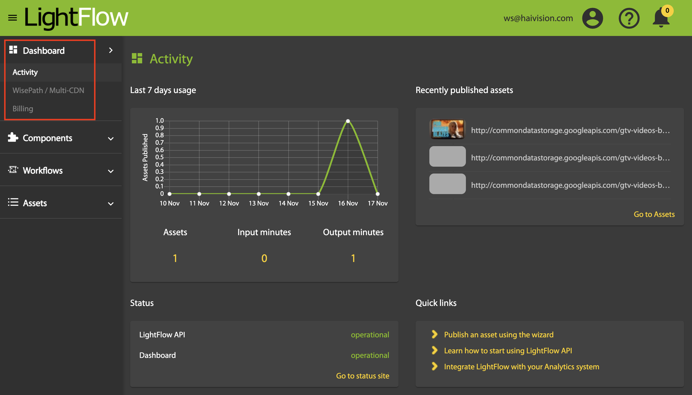 The LightFlow Dashboard provides an overview of your activities, as well as access to more detailed information. The Dashboard panels are described in the following sections: