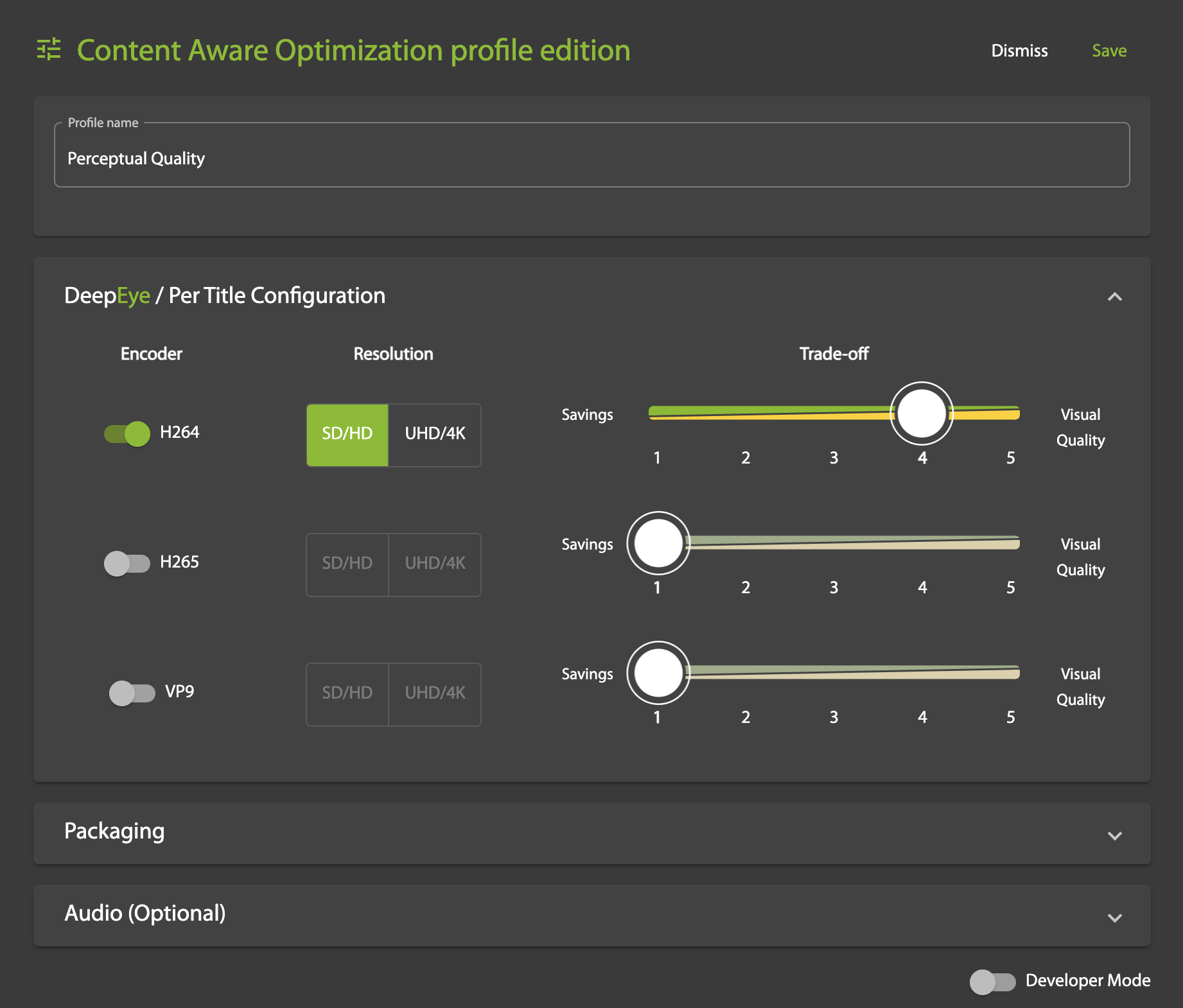 To create a new Content Aware Optimization profile, start by giving it a Name. In the DeepEye/PerTitleConfiguration section, select one or more Encoder output codecs, the corresponding Resolution(s), and set the associated Trade-off slider to choose a preset that targets your preferred balance between cost savings and visual quality: